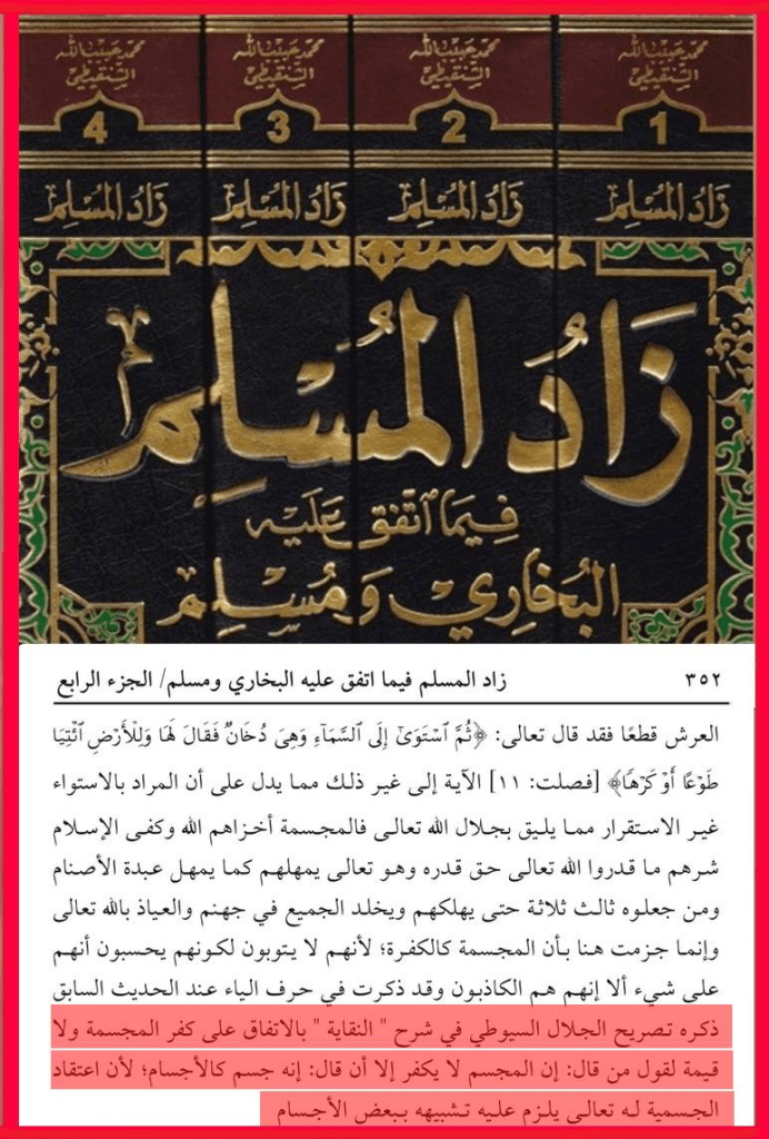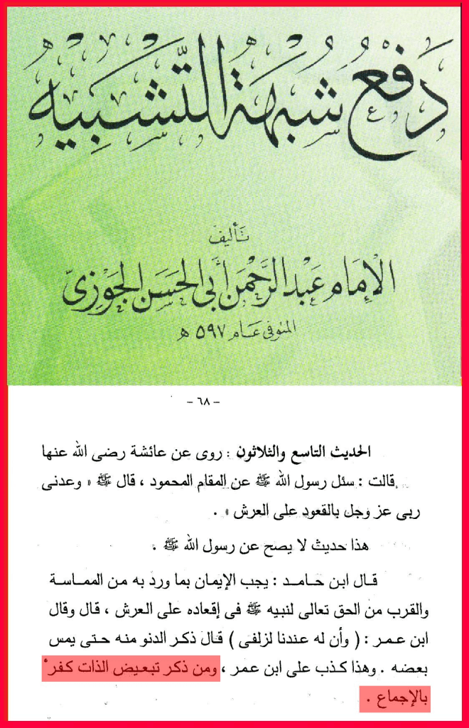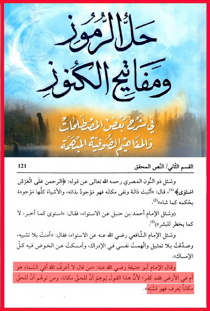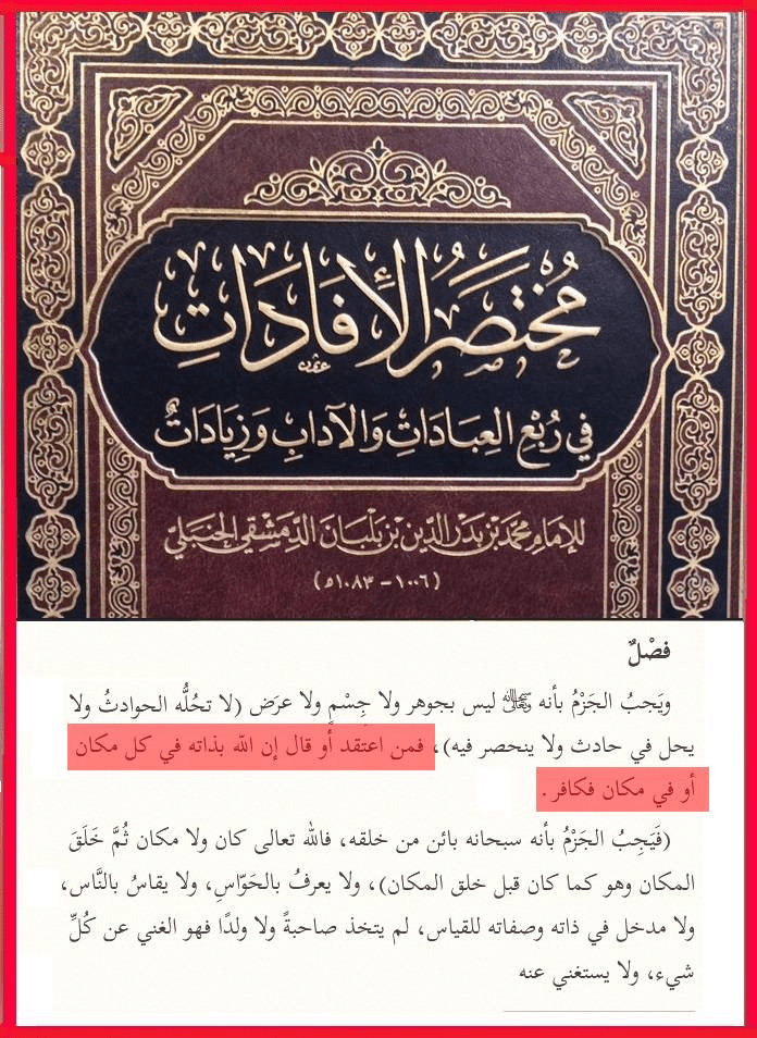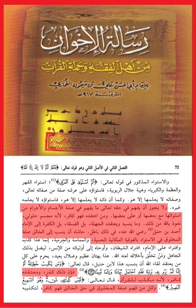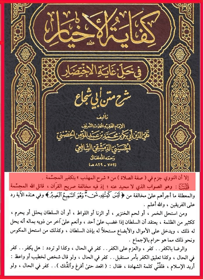 الحمد لله الواحد الأحد، الفرد الصمد، المنزه عن الصاحبة والولد، وعن الجهات الست فلا يُحد، وعن الأعضاء فليس بجسد، والصلاة والسلام على سيدنا محمد خير الكائنات وعلى آله وأصحابه البررة السادات. أما بعدُ، قال الله تعالى (ولتكن منكم أمة يدعون إلى الخير ويأمرون بالمعروف وينهون عن المنكر). وروى الإمام أحمد من طريق اسماعيل بن أبي خالد عن قيس بن أبي حازم قال: قام أبو بكر رضي الله عنه فحمد الله وأثنى عليه ثم قال: يا أيها الناس أنكم تقرءون هذه الآية (يا أيها الذين ءامنوا عليكم أنفسَكم لا يضركم من ضل إذا اهتديتم) وإنّا سمعنا رسول الله صلى الله عليه وسلم يقول (إن الناس إذا رأوا المنكر فلم يغيروه أوشك أن يعمهم الله بعقابه). فمن زعم أن الله تعالى جسم مركب له حد وأعضاء وأنه يسكن السماء أو أنه فوق العرش بذاته فقد كفر بالله العظيم ونسب إلى ذاته صفات المحدثين وخالف ما جاء به المصطفى الأمين عليه أفضل الصلاة وأتم التسليم. وهاكم بعض النقول من أقوال علماء أهل السنة والجماعة ممن نص على كفر من نسب لله الجسم والأعضاء …