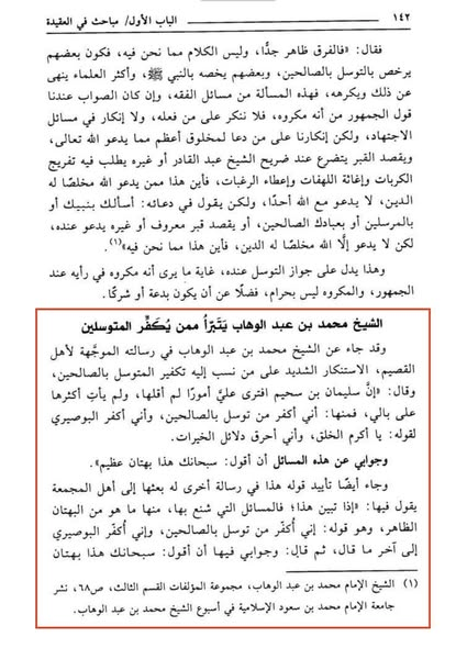 هذا وقد تبرأ محمد بن عبد الوهاب ممن كفر المتوسلين كما في رسالته لأهل القصيم، بعكس ما يفعل أتباعه اليوم.