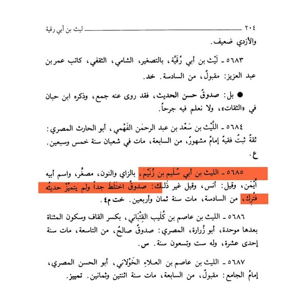– وقال عنه ابن حجر: “الليث بن أبي سليم ضعيف” وقال: صدوق اختلط جدا”.