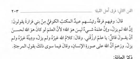 لكن جاء في كتاب المقالات ومعه عيون المسائل والجوابات لأبي القاسم البلخي المعتزلي المتوفى سنة 319 هجري ما نصه: ” وفيهم فرقة رئيسهم عبيد المكتب الكوفي من بني فزارة يقولون: “إن الله لم يزل، وإن علمه شيء ليس هو الله؛ لأن العلم لو كان هو الله لحسن أن يقول قائل: يا علم ارزقني. وقال: كلام الله غيره ولم يزل، ودينه غيره ولم يزل. وزعم أن الله على صورة الإنسان، وقال فيما سوى ذلك بقول المرجئة”. انتهى