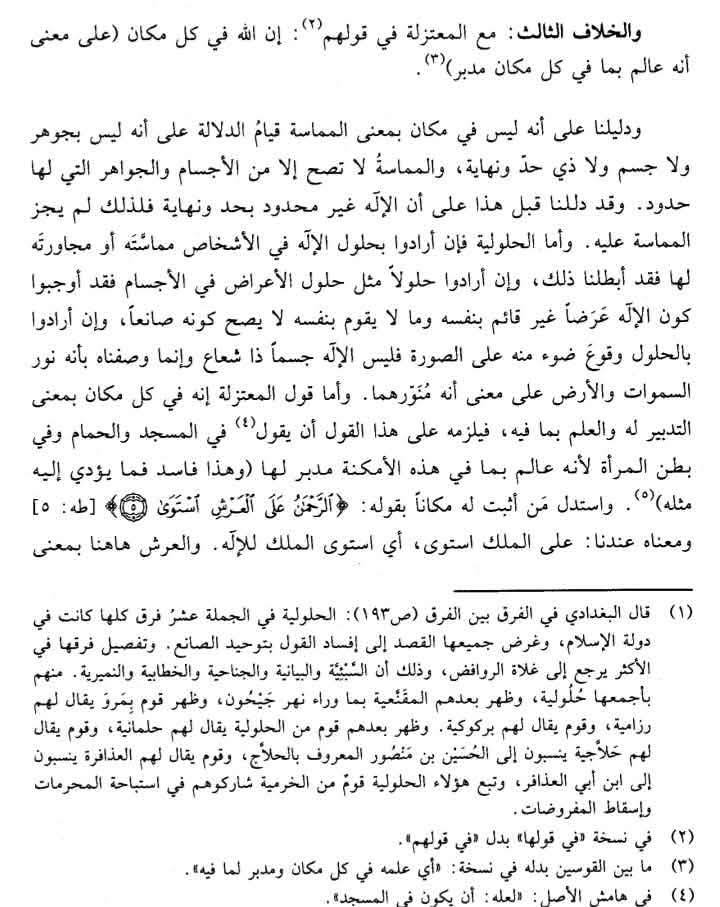 في ما يلي رد الإمامين أبي الحسن الطبري وأبي منصور البغدادي شيخي الأشعرية على المعتزلة في قولهم أن الله بكل مكان بالتدبير.