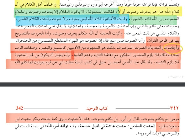 و ما ذكره في كتاب التوحيد من إثبات الصوت قال إنه صوت قديم ولم يحمله على الظاهر الذي تقوله المشبهة إنه صوت حادث يحدث شيئًا فشيئًا يتخلله سكوت كما قال زعيم المشبهة ابن تيمية إن كلامه تعالى قديم النوع حادث الأفراد.»