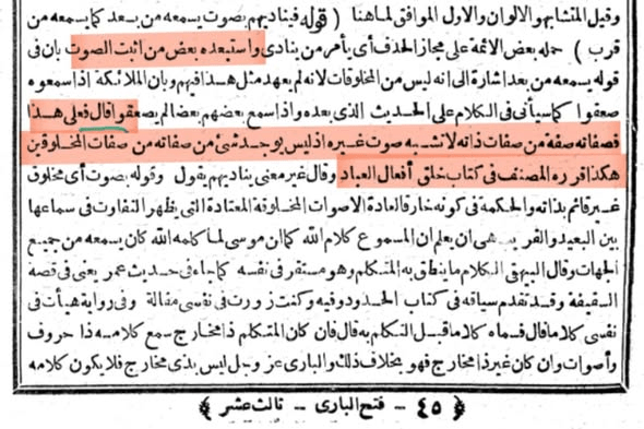 •التعقيب: نقل ابن حجر عن أحد المتكلمين أن أكثر الحنابلة قالوا بأن الأصوات والحروف هي المسموعة من القارئين، وهذا فيه اشارة لمذهب بعض الحنابلة الذين وافقوا الأشعرية في نفي الصوت والحروف عن الله وأنها فقط المسموعة من القراء. وأنكر كثير منهم هذا القول، وهؤلاء أغلبهم الذين مالوا لمذهب التجسيم.