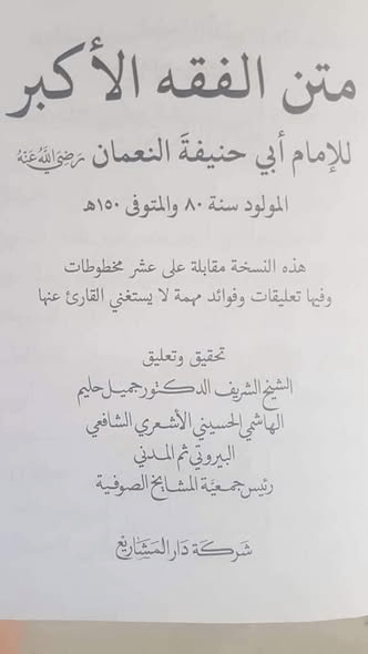 وعند المُراجعة تبيَّن أنَّ فرحة قلوب المُؤمنين الشَّيخ جميل حليم حفظه الله لم يُخفِ شيئًا بل حقَّق كتاب [الفقه الأكبر] لأبي حنيفة على عشر نُسخ مخطوطة لدَيْه في بعضها عبارة <وَلَمْ يَرْتَكِبْ كَبِيْرَةً وَلَا صَغِيْرَةً قَطُّ> وليست في كُلِّ النُّسَخ فأثبتها في الهامش دُون النَّصِّ وكَتَبَ: <[1]: وفي (أ) و (ب) زيادة: (ولم يرتكب كبيرة ولا صغيرة قط)> انتهى.