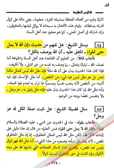 يقول محمَّد بن صالح العُثَيمِين شيخ الوهّابية في فَتاوِيه في شرح حديث (إنَّ اللهَ لا يَمَلُّ حتَّى تَمَلُّوا) ما نَصُّه (فإنَّ مَلَلَ اللهِ ليسَ كَمِثْلِ مَلَلِنَا نحنُ بل هُوَ مَلَلٌ لَيسَ فيهِ شىءٌ مِنَ النَّقْصِ، ثم قال فَإِنَّهُ مَلَلٌ يَلِيْقُ بِهِ عَزَّ وَجَلَّ، وقَال أمّا مَلَلُ اللهِ فهُوَ كَمالٌ وليسَ فِيْهِ نَقْصٌ، ويَجْرِي هذا كَسَائِرِ الصِّفاتِ التي نُثْبِتُها للهِ علَى وَجْهِ الكَمالِ وإنْ كانَتْ فِي حَقِّ الْمَخْلُوقِ لَيسَت كَمالاً). انتهى
