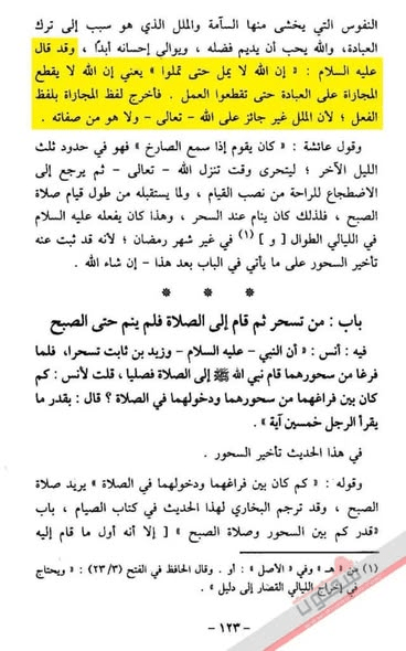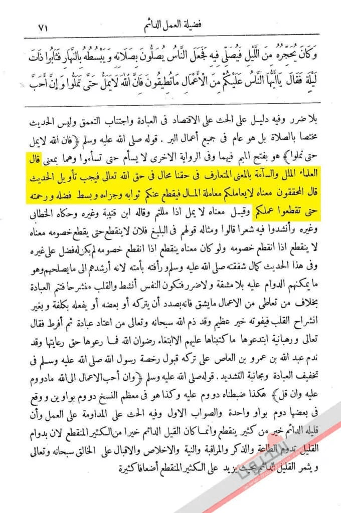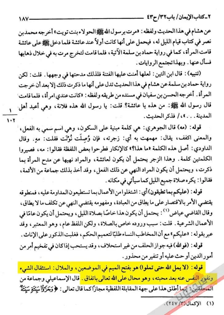 قال الإمامُ أبو الحَسَن ابنُ بَطَّالٍ (ت 449هـ) في شرحه على البخاريّ ما نَصُّه (وقد قال صلى الله عليه وسلم (إنَ اللهَ لا يَمَلُّ حَتَّى تَمَلُّوا) يعني ![]()