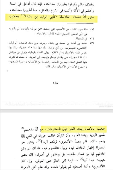 نقل شيخ المجسمة ابن تيمية في تلبيس الجهمية قوله: حتى أن فضلاء الفلاسفة كأبي الوليد ابن رشد يحكون مذهب الحكماء اثبات العلو فوق المخلوقات”. انتهى