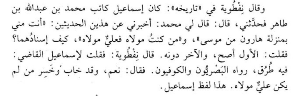 قال نفطويه في تاريخه أن اسماعيل القاضي قال: “قد خاب وخسر من لم يكن عليٌّ مولاه”. انتهى