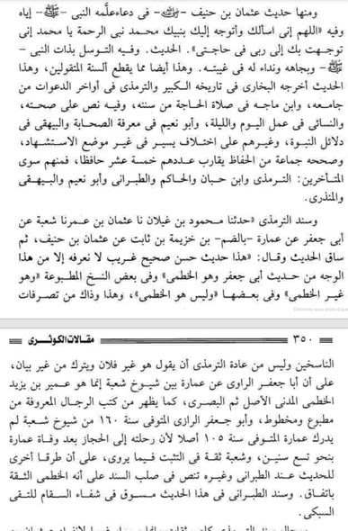 وموضع الاستشهاد أن الصحابي المذكور فهم من حديث دعاء الحاجة أنه لا يختص بزمنه صلى الله عليه و سلم، وهذا توسل به، ونداء بعد وفاته صلى الله عليه وسلم وعمل متوارث بين الصحابة وقد أخرج هذا الحديث – المرفوع والموقوف- الطبراني المتوفى سنة 360هـجري، في معاجمه الثلاثة وصححه، والحافظ الطبراني، هو الذي وصفه الذهبي في تذكرة الحفاظ بـ”الحافظ الإمام العلامة الحجة بقية الحفاظ مسند الدنيا”.