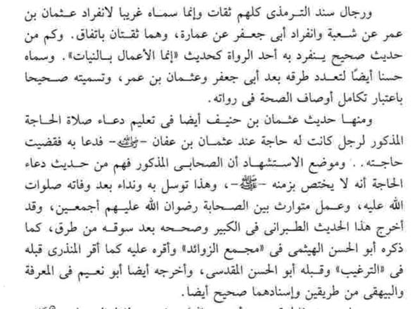 ” عن عثمان بن حنيف أن رجلاً كان يختلف إلى عثمان بن عفان في حاجة له فكان عثمان لا يلتفت إليه ولا ينظر في حاجته– أي لنسيانه لها – فلقى عثمان بن حنيف، فشكا ذلك إليه، فقال له عثمان بن حنيف: “ائت الميضأة فتوضأ ثم ائت المسجد فصل فيه ركعتين، ثم قل: “اللهم إني أسألك وأتوجه إليك بنبينا محمد صلى الله عليه وسلم نبي الرحمة يا محمد إني أتوجه بك إلى ربي فيقضي لي حاجتي، وتذكر حاجتك، ورح إليّ حين أروح معك”. فانطلق الرجل فصنع ما قال له، ثم أتى باب عثمان فجاء البواب حتى أخذ بيده فأدخله على عثمان بن عفان فأجلسه معه على الطنفسة وقال: حاجتك؟ فذكر حاجته فقضاها له ثم قال له: ما ذكرت حاجتك حتى كانت هذه الساعة، وقال: ما كانت لك من حاجة فائتنا.