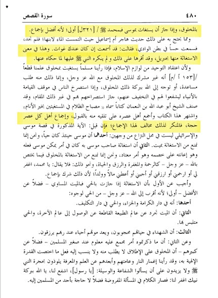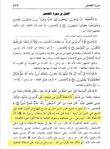 وبين أن ذلك استغاثة المخلوق بالمخلوق، فالحي هو مخلوق من خلق الله، والميت، كذلك. فكما جاز الاستغاثة بالحي على وجه التسبب، جاز الاستغاثة بالميت أيضا على وجه التسبب، مع اعتقاد أنه لا نافع ولا ضار على الحقيقة إلا الله.
