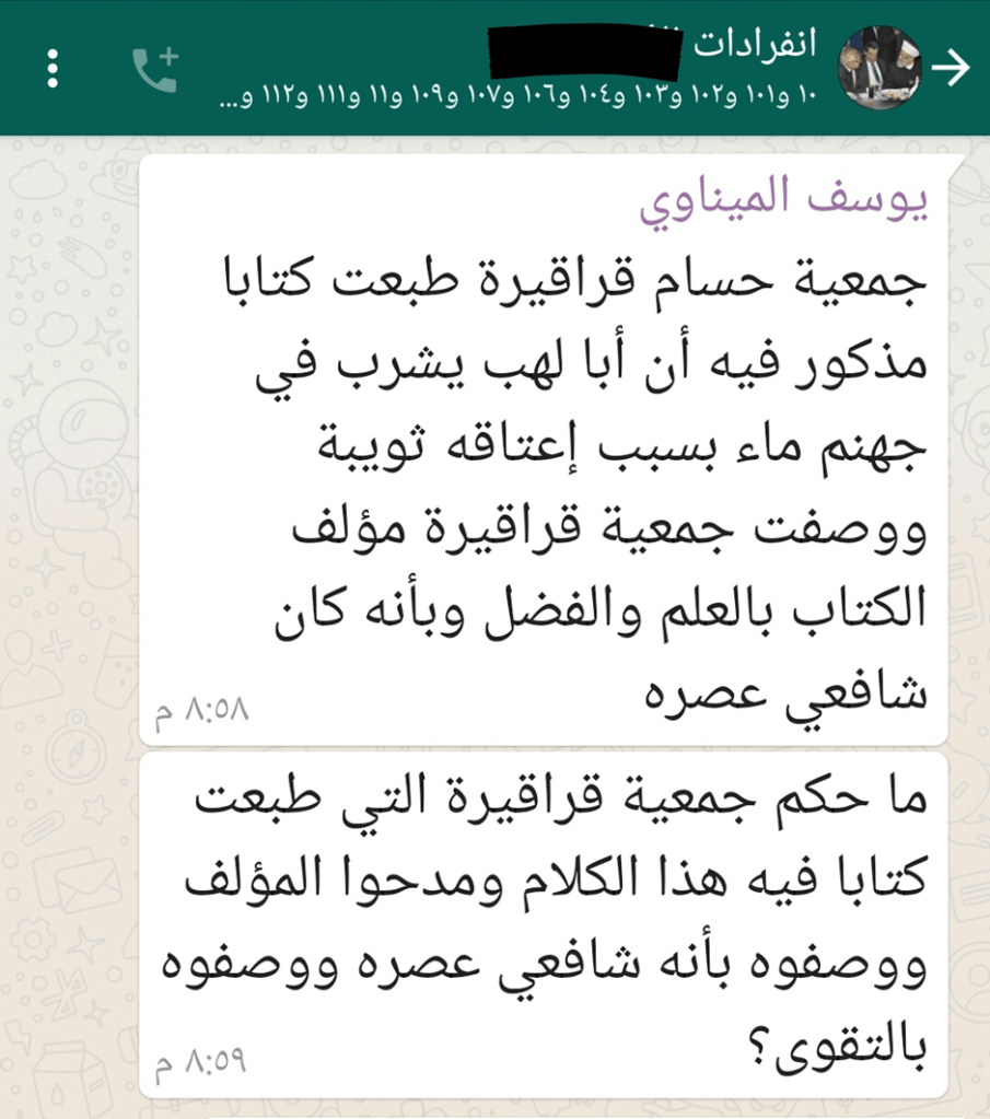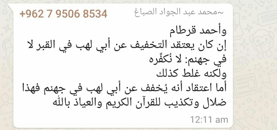 *<وأحمد قرطام.. إن كان يعتقد التخفيف عن أبي لهب في القبر لا في جهنم: لا نُكفِّره – ولكنه غلط كذلك>* انتهى بحروفه