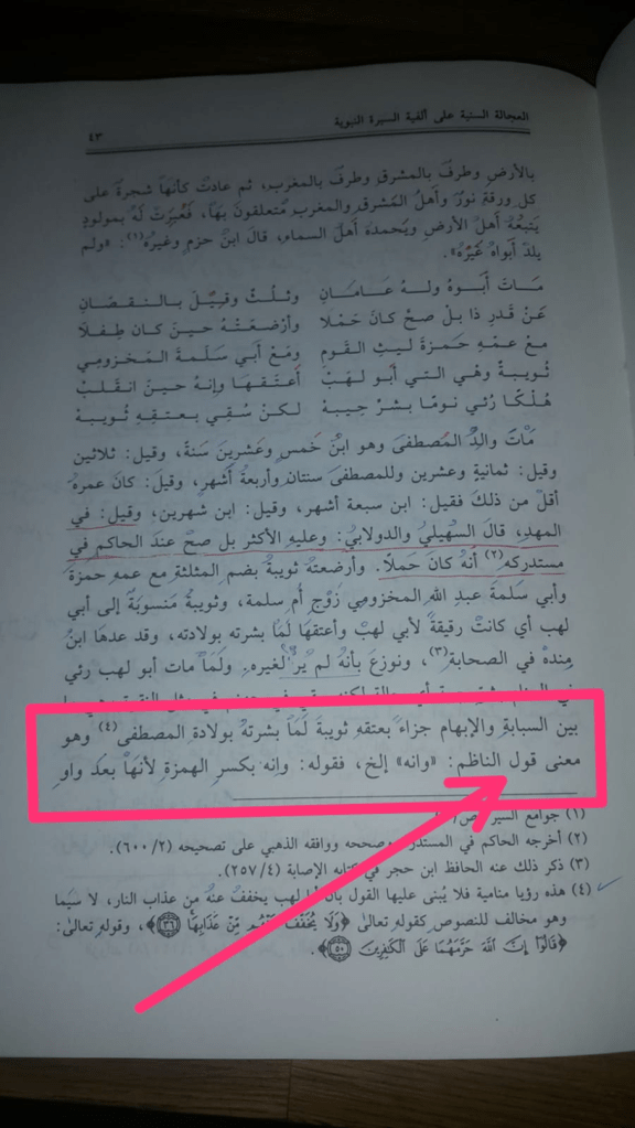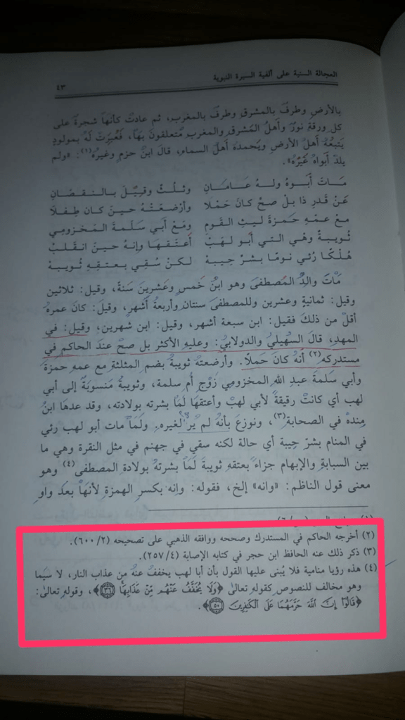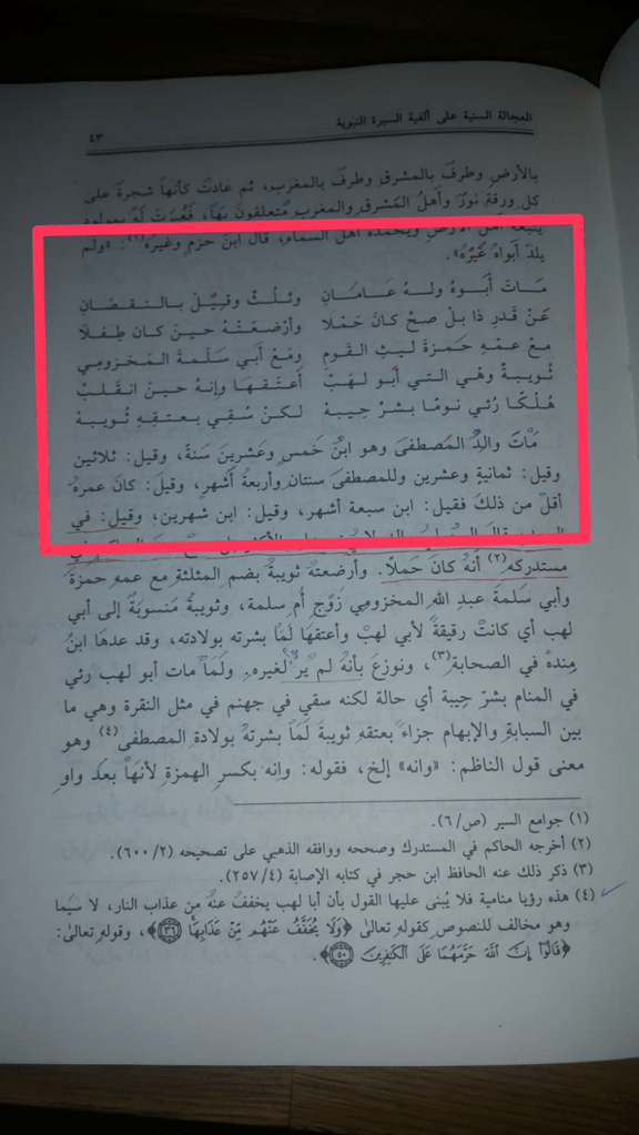*<ولما مات أبو لهب رئي في المنام بشرِّ حيبة أي حالة لكنه سقي في جهنم في مثل النقرة وهي ما بين السبابة والإبهام جزاء بعتقه ثويبة لما بشرته بولادة المصطفى وهو معنى قول الناظم: “وإنه” إلخ.. فقوله: وإنه بكسر الهمزة لأنها بعد واو الحال. وقوله: “حين انقلب” أي انتقل إلى الله، و”هلكًا” بضم الهاء مصدر من الهلاك الموت، و”رئي” مبني للمفعول، و”نوما” أي في المنام، و”بشر حيبة” بكسر الحاء المهملة ومثناة ساكنة وباء موحدة أي في شر حالة، والرائي له العباس أو غيره، و”سقي” بالبناء للمجهول، _وهذا الماء الذي يسقاه ليس ماء الجنة لحرمة شرابها على الكفار_>* انتهى كلام الشيخ المناوي.